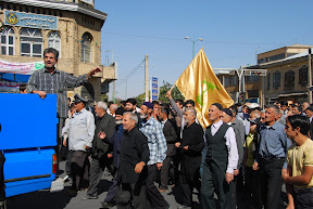 Tato taškařice, připomínající 1. máj v časech dávno minulých, má za účel podpořit muslimské bratry v Palestině a poslat do horoucích pekel Izrael s USA. Dav provolává hesla: “Alláh Akbar….smrt Izraeli….smrt USA“ a tak nějak pořád dokola. No je veselo. Krom vlajek a dalších transparentů je k mání i plakát s nápisy v fársí a angličtině „Down with USA, Down with Izrael“. Ti v průvodu vypadají docela vážně, přihlížející mám dojem se docela baví. Chvíli fotím, než se dám do řeči s několika fotografy – profesionály, kteří se mě ptají, zda nejsem také náhodou journalist. Okamžitě odpovídám, že jsem pouhý turista, páč tak nějak tuším, že tím pádem je větší šance, že nedostanu na budku. Však mně taky hned radí, ať okamžitě schovám foťák. Sice nerad, ale co se dá dělat.